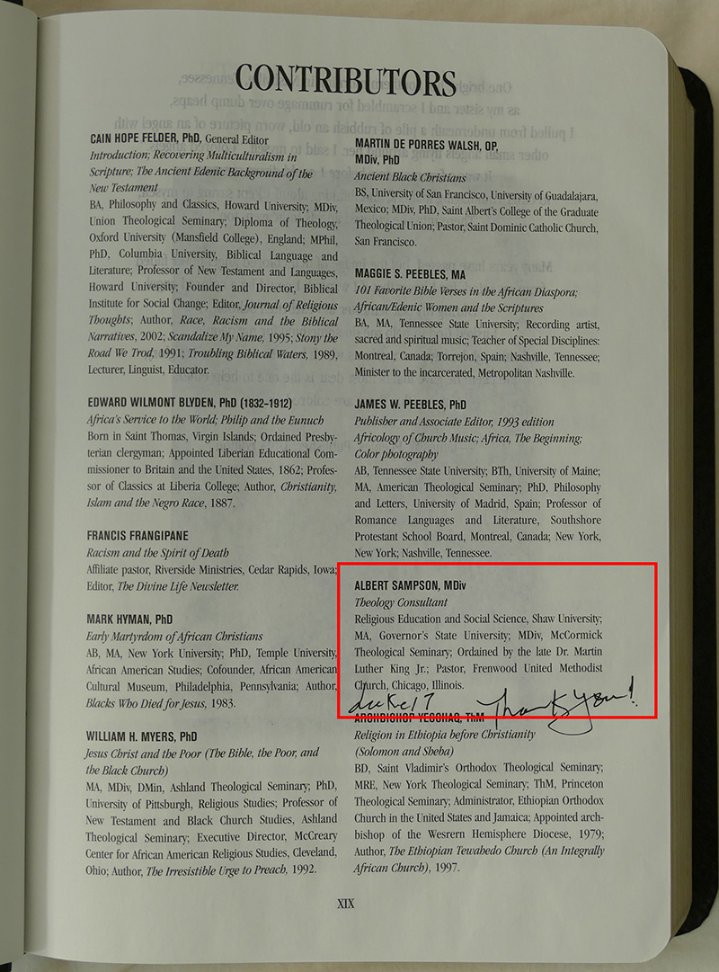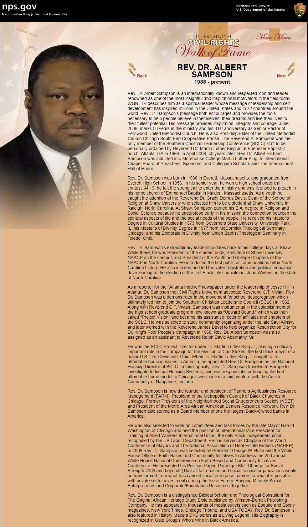 - Hosea 4:6 -The Reverend Dr. Albert Sampson was the only member of the Southern Christian Leadership Conference (SCLC) staff to be personally ordained by Reverend Dr. Martin Luther King Jr. at Ebenezer Baptist Church, Atlanta, GA in 1966. In April 2006, 40 years later, Rev. Dr. Albert Richard Sampson was inducted into Morehouse College Martin Luther King Jr. International Chapel Board of Preachers, Sponsors, and Collegium Scholars and The International Hall of Honor. Rev. Dr. Albert Sampson is an internationally known and respected icon and leader renowned as one of the most insightful and inspirational motivators in the field today. WGN -TV describes him as a spiritual leader whose message of leadership and self development has inspired millions in the United States and in 72 countries around the world. Rev. Dr. Sampson is a distinguished Biblical Scholar and Theological Consultant for The Original African Heritage Study Bible published by Winston-Derrick Publishing Company. He has appeared in thousands of media outlets such as Esquire and Ebony magazines, New York Times, Chicago Tribune, and USA TODAY. Rev. Dr. Sampson is also featured in History Makers DVD series as a Living Legend. His Biography is recognized in Gale Group's Who's Who in Black America.